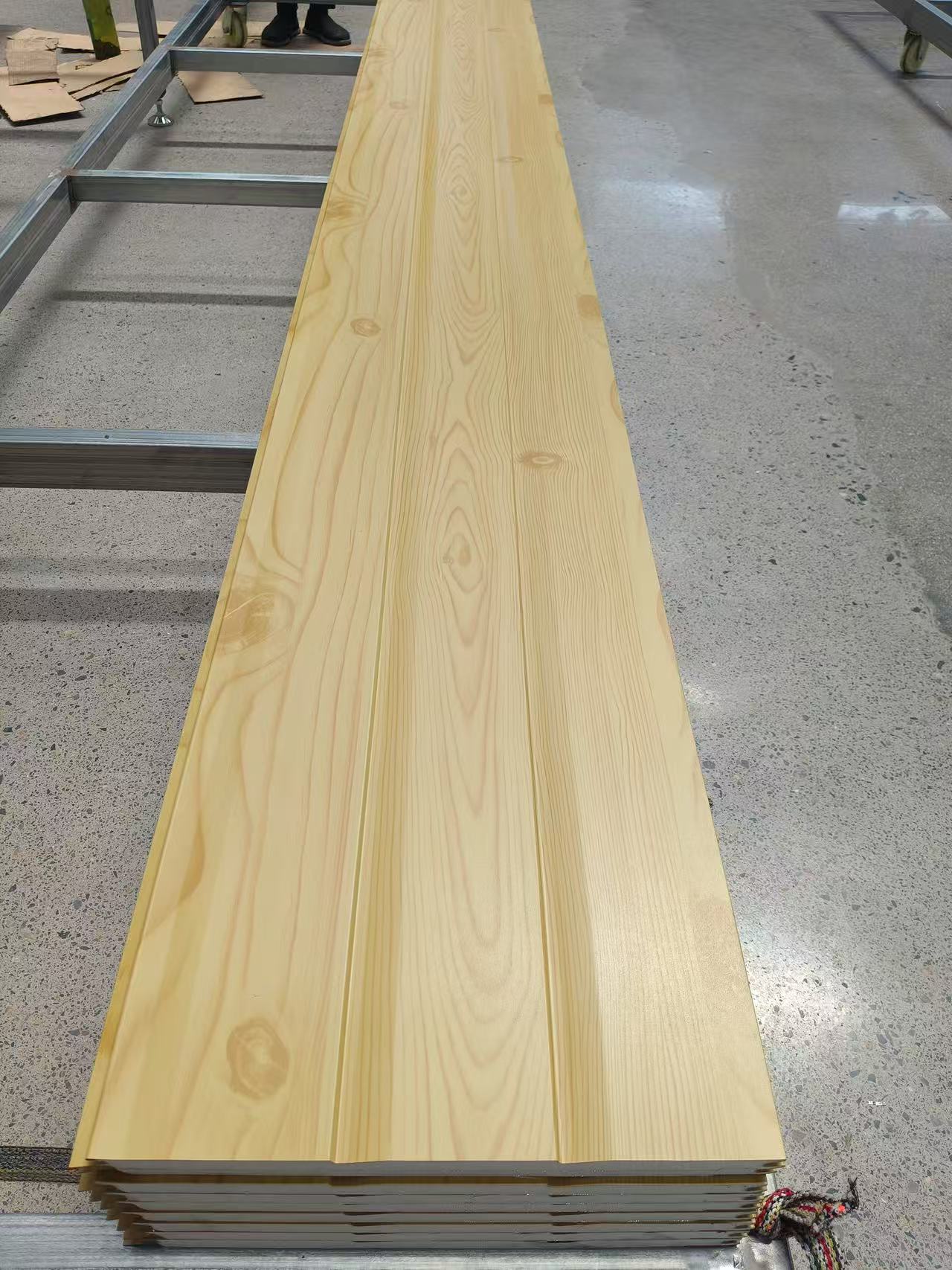Surface layer: A specially coated, colored embossed metal sheet, pressed to create a yellow wood-grain texture and grooved design, creating a wood-like visual effect ,Modern Decorative Metal Panel Design.